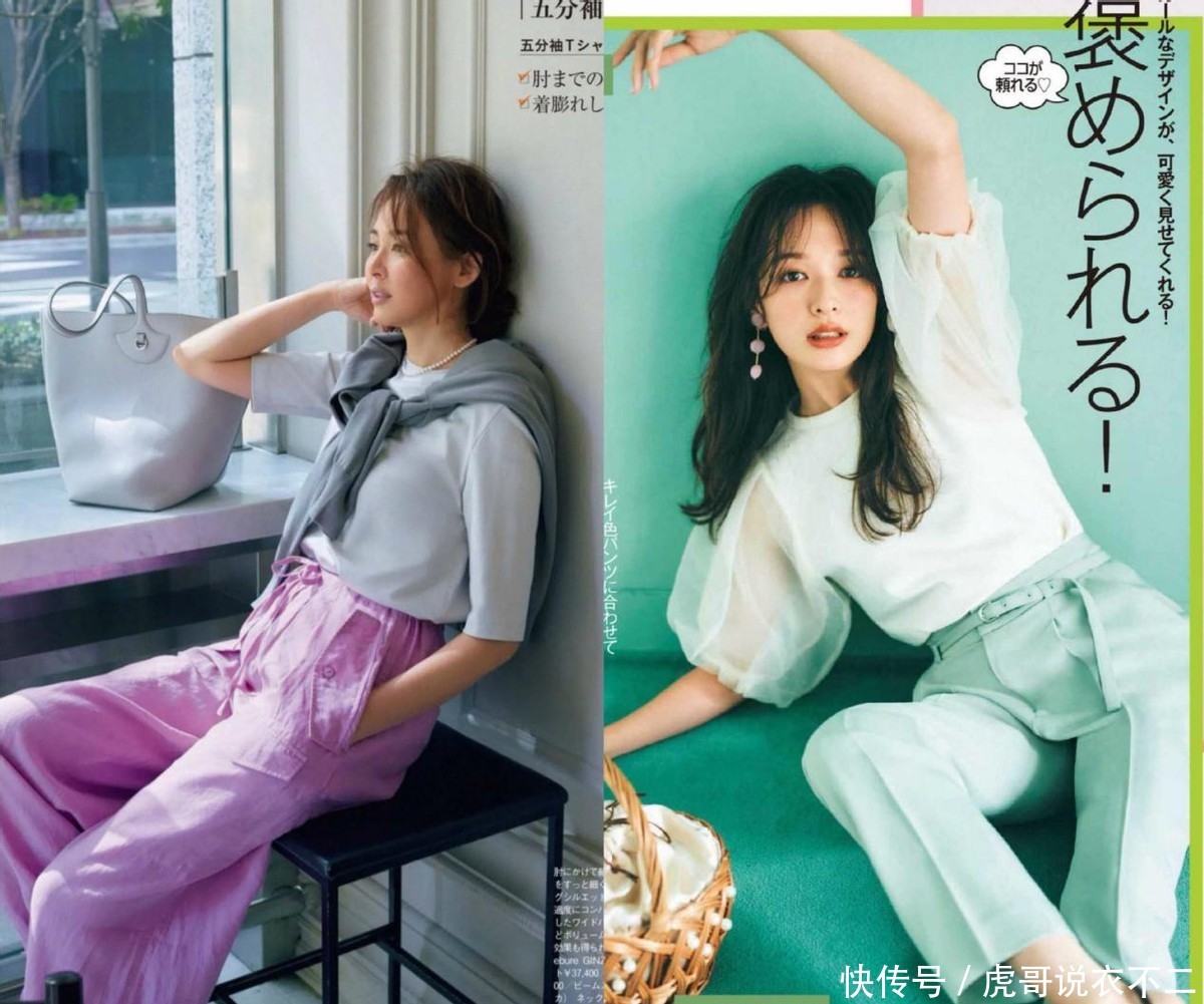 像这两套穿搭,采用的上衣以及裤装皆是不同庚事阶段的女性皆会使用到的类型。白色衬衫高出百搭,偶而会显得干练,偶而会创造出平静感,而白色T恤也相同有着极高的实用价值。